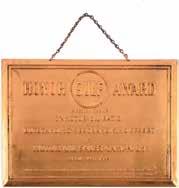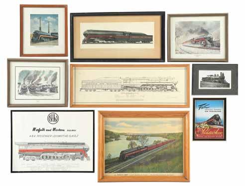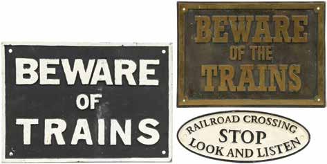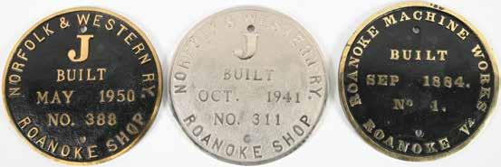 Largest: 12” D. (A) A desk pyramid sign, two-sided mahogany, “RUN THE TEAM SAFELY” with N&W logo. (B) Two cast bronze N&W circular logo signs, one with a 1938 date. (C) A cast aluminum N&W Ry Safety First logo sign, painted with gold letters on a black field. (D) A wooden N&W Safety First logo sign, nicely painted. (E) N&W Ry “Precision Transportation” wooden sign, nicely painted. (F) Cast bronze N&W logo sign from the 1960s. (G) Stoddart’s Limited Company 3-D railroad art sign of the N&W circular logo, nicely painted. (H) Stoddart’s Limited Company 3-D railroad art sign rectangular sign with Powhatan arrow logo, nicely painted. (9.0). 400 - 800