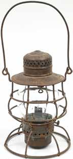Largest: 7” D x 10” T. (A) An Adams & Westlake double steel guard, 1897 pat. model with big insert fount and No. 2 ratchet burner. The lid is embossed “N&W R.R.”. This model has a removable top globe holder and nice vent hole filigree. The selenium red No. 39 Corning non-ex globe is embossed “N&W.” The globe shows little railroad wear. The entire frame is painted black. (Very Good). (B) An A&W “ADAMS” No. 39 double steel guard model with big insert fount and No. 2 ratchet burner. The lid is embossed “N&W. R.R.”. The clear No. 39 globe is an unmarked Vulcan-style with normal railroad wear. The entire frame shows some light rust pitting and minor rust with some pinholes in the fount cup. (Fair). (Fair - Very Good). 300 - 500