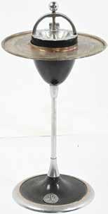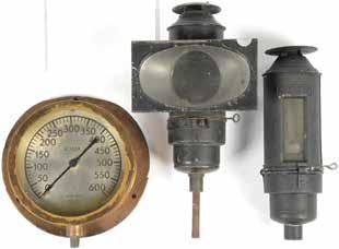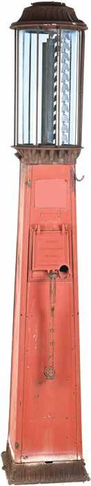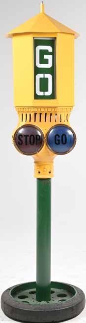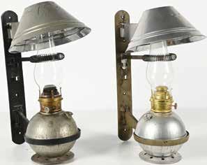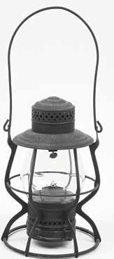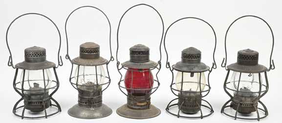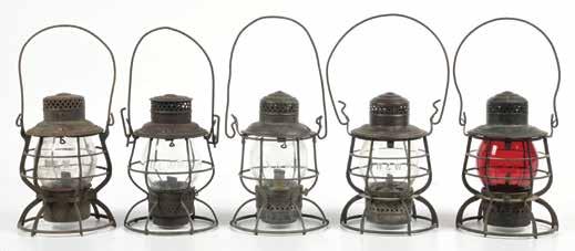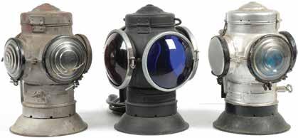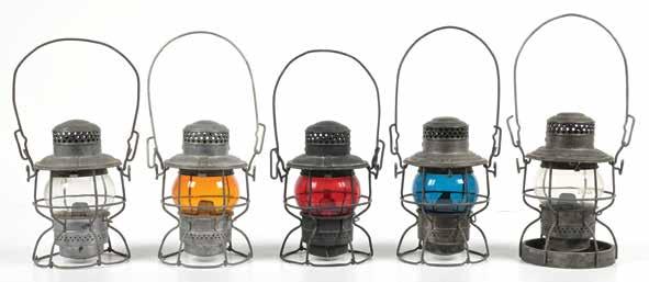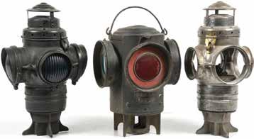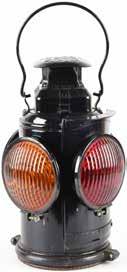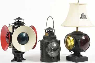 Largest: 8 - 1/2” x 8 - 1/2” x 22”. (A) An Armspear switch lamp with two red and two white day targets and two red and two green glass lenses. There appears to be a provision for electrification inside, but there are no electrical components. “N&W Ry.” marked on the chimney side. The body is painted black. (Very Good). (B) A railroad cannonballstyle switch stand lamp with clear, red, green, and yellow lenses, made into a lamp. The lampshade has an embroidered N&W logo patch sewn on it. There is an 18AWG lamp cord with old plug. The lamp has not been tested for operation and is being sold as-is. It is mounted on a nice square wood block. The entire unit is painted black. (Very Good). (C) An Armspear semaphore lamp with “N&W RY” embossed on a tag affixed to the lamp body. There is one clear optical lens and one fisheye peephole lens. The lamp is complete with the proper fount, burner, and internal chimney. Shows original black deteriorated paint. (Good). (Good - Very Good). 200 - 600