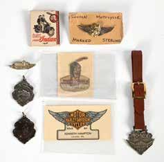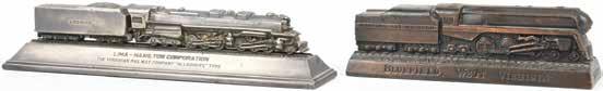 Largest Box: 16 - 1/4” x 121/4” x 2”. (A) A flat of convention ribbons, N&W uniform emblems, and safety pin-backs. (Very Good). (B) A flat of N&W watch fobs, safety pins, tie clasps, Brotherhood Convention pin, and celluloid pins. (Very Good). (C) A flat of N&W ink stamps, including logos and locomotives. (Very Good). (Very Good). 200 - 600