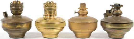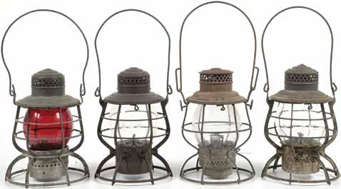 Largest: 7” D x 10” T. (A) An Adlake No. 250 Kero, marked “F.E.C. Ry. Co.” on the soot cap. A No. 250 fount and burner set is intact. The red Kopp Kero globe is not railroad marked. The bottom ring is slightly bent in two places. (Very Good). (B) An Adlake Kero pre-war model, marked “N&W Ry” on the lid reflector. The clear Kopp Kero globe is embossed “N&W”. (Good). (C) An Adlake Kero model with a 3-63 manufacture date. The lid is marked “N&W. RY”. The clear Corning globe is embossed “Adlake Kero” and etched “N&W” in known stencil font. (D) An Adlake No. 250 Kero model with a bent steel bail and the correct Adlake No. 250 fount and burner set. The red Kopp Kero globe is embossed “N&W”. (Very Good). (Good - Very Good). 300 - 600