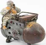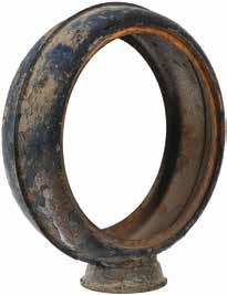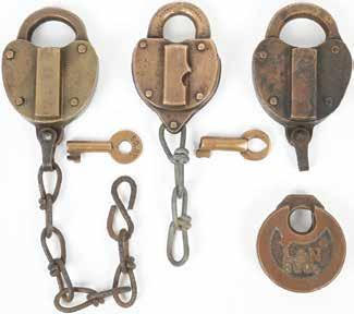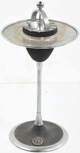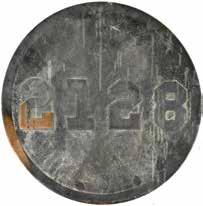 Largest: 4” D. x 9 - 1/2” T. (A) Four engineer’s torches embossed “N&W Ry Co” on the body, three made by the Gem Mfg Co., the other unmarked. (B) A torch stamped “N&W Ry Co” on the bottom. (C) A cast iron torch embossed “N&W Ry”, made by the Dayton Malleable Iron Company. (D) A triangular, copper body torch with no railroad markings. (E) A Dayton Malleable Iron Company torch embossed “N&W RR” on the body. (Fair).