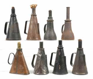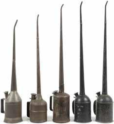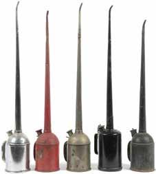 Largest: 5” D. x 30” T. Two long spout oilers marked “N&W Ry Co”, one marked “N&W”, one marked “Wabash Ry”, and the last one is marked “Soo Line”. Some have black paint, some have tight rust patina. (Good).