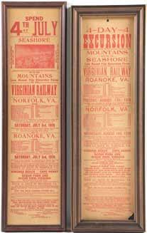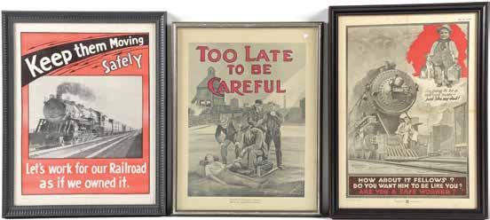 Each: 10 - 1/2” x 25 - 1/2”. (A) A round-top, oak framed safety cartoon, “TOO FAST!” with train and character on multi-colored poster behind glass. Bottom shows Roanoke Safety Committee with names and dated January 1st, 1972. The arched top of the frame unit has an early N&W Safety First logo in red, black and gold, along with the slogan, “Remember it is better to be careful than to be crippled.” (B) A round-top oak framed cartoon with a safety slogan on it, “No Matter What Field, Let Safety Be Your Shield”, showing different railroad occupations under glass. Bottom shows the Bicentennial SD-45 N&W locomotive (1976). The arched top of the frame unit has an early N&W Safety First logo in red, black and gold, along with the slogan, “Remember it is better to be careful than to be crippled.” (Very Good). 200 - 600