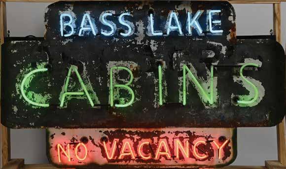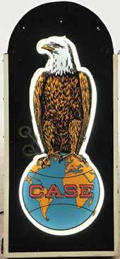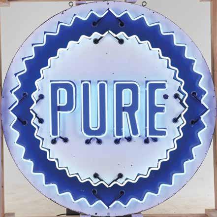 22” x 7” x 107”. SSP. C. 1950s. CONDITION: Sign shows excellent color and gloss throughout the blue, with bright red neon throughout each letter. Sign shows minor cloudiness and discoloration in the white with minor areas of surface scratching in the field. Sign shows moderate chipping along the outer edge and is mounted on a newly made metal can, which displays the sign well. Overall excellent and well displaying. This is not a standard shippable item and will require 3rd party shipping or pickup arrangements to be made. (8.5). 3,000 - 8,000