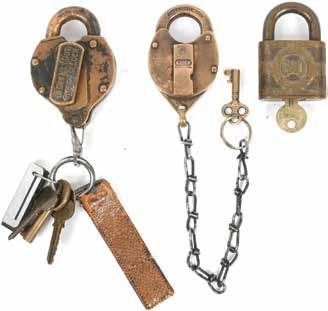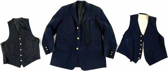 Largest: 23” x 34”. (A) A conductor’s uniform jacket and vest ensemble made by Carlson & Co., Chicago, for a Santa Fe conductor. The vest has six gold buttons embossed with the Santa Fe cross logo. Approximate size is 44. This set is complete with a black necktie. (B) A conductor’s vest with five gold buttons embossed with the Conrail logo. (Very Good). 200 - 400