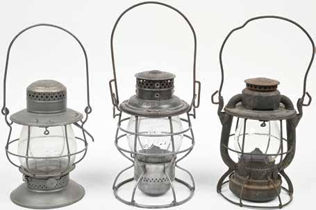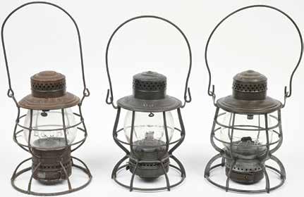 Largest: 7” D x 10” T. (A) An A&W 1892 pat. double steel guard “ADAMS” model with the correct bayonet fount and No. 2 ratchet burner. The lid reflector is embossed “N&W. R.R”. The top globe holder is removable. The clear No. 39 extended-base globe is heavily embossed “N&W” in serif font, but is badly cracked in two places. (Fair). (B) An Adlake Reliable double steel guard model with a large insert fount and No. 2 ratchet burner. “N&W. RY” is embossed on the lid reflector. The clear No. 39 Corning non-ex globe is embossed “N.&W.”. Lantern shows light rust. (Very Good). (C) An Adlake Reliable double steel guard model with large insert fount and No. 2 ratchet burner. “N&W. Ry” is embossed in the lid reflector. The top is pushed in. The entire frame is loose and is missing three of six support gussets in the fount cup. The Corning-style No. 39 globe is embossed “N&W”. (Fair). (Fair - Good). 200 - 500