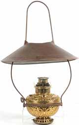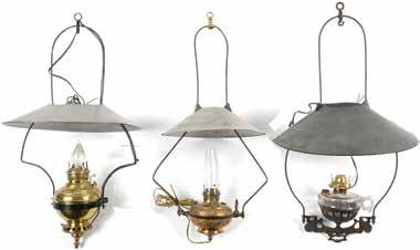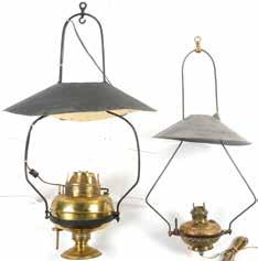 Largest: 21” Dia. x 30” T. (A) A large, brass-bodied hanging oil lamp that was electrified long ago. There is a 18AWG electrical cord feeding an electrical socket. The hanging hoop is wire with a steel socket holding the lamp suspended. There is a pebbled tin shade that slides over the hanging hoop and is painted black, with a white-painted underside. The lamp appears to be in good condition, but is missing a hurricane chimney. The electrical components have not been tested and the lamp is being sold as-is. (B) A brass-bodied hanging lamp with a cast iron suspension hoop and wire loop. This unit has been electrified and shows an 18AWG gold power cord with an ivory clip-on plug. This unit has a silver tin shade. The lamp does not include a hurricane chimney. (Good). 400 - 800