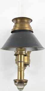 14” D. x 21 - 1/2” T. A large wall-mount lamp, complete with fount, burner, and inside hurricane chimney. The outside globe is lightly frosted. The lamp is complete with a wall-mounted bracket and shows a light tarnished brass surface. (Very Good). 200 - 600