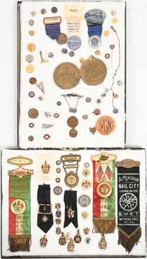 Shadow Boxes: 16 - 1/4” x 12 - 1/4” x 3/4”. Two flats with a collection of B of LF & E convention ribbons, watch fob medallions, pin-backs, watch chains, and celluloid pin-backs. (Very Good). 200 - 600
