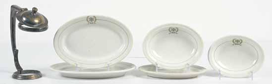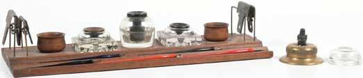 largest: 24” x 9 - 1/2” x 5”. A very nice carved mahogany base containing two water wells and three glass inkwells. The left and right heavy glass, square inkwells are embossed “N&W” on the inside rim. The center round glass element is not railroad marked and doesn’t fit the pocket like the others. There are five fountain pens included, as well as an extra glass inkwell that is also embossed “N&W”. There is also a heavy brass separate inkwell included. (Good). 200 - 600