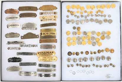 Shadow Boxes: 16 - 1/4” x 121/4” x 3/4”. (A) A flat of many N&W uniform buttons, including several designs in both gold and silver and in small and large sizes. (Very Good). (B) A flat of generic occupational hat badges, including conductor, engineer, fireman, brakeman, yard conductor, flagman, freight conductor, and parlor car conductor. (Very Good). (Very Good). 200 - 600