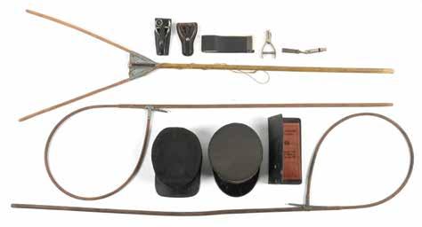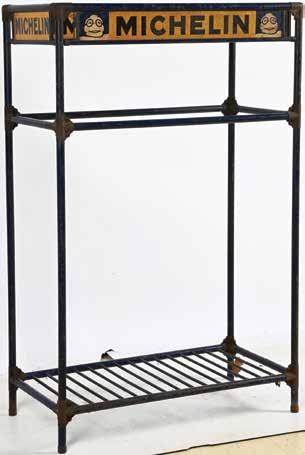 Largest: 64” x 12”. Two steel round tube overhead luggage racks with cast iron ends and provision for hanging horizontally. Both show old blue paint on portions, as well as black enamel on parts of the rack tubes. This is not a standard shippable item and will require 3rd party shipping or pickup arrangements to be made. (Good). 200 - 500