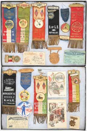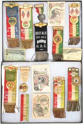 Shadow Boxes: 16 - 1/4” x 121/4” x 3/4”. (A) A very nice flat of B. of L.E. convention ribbons, watch chains, pin-backs, watch chain medallions, and badges. (Very Good). (B) A flat of ORC convention ribbons, badges, N&W uniform collar bullions, pin-backs, hat badges, and watch fob medallions. (Very Good). (Very Good). 200 - 800