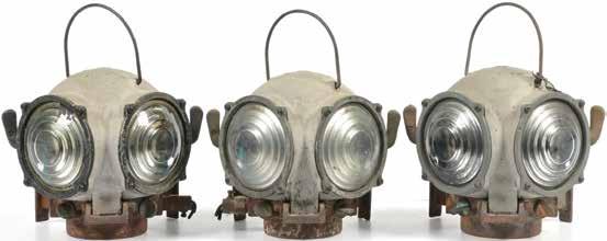 Each: 9” x 9” x 13”. Three Pyle-National Company electric locomotive classification lights that can display either clear or green aspects. The electrical wiring has been cut at the base. These have not been tested for functionality. One of the units is missing one of the peephole glasses. The green aspects appear to be intact inside the lamps, but were not inspected. Each lamp has two clear optical lenses, with the rotating green aspects inside the lamps. The cast iron, forked bases show light rust. (Good). 300 - 1,200