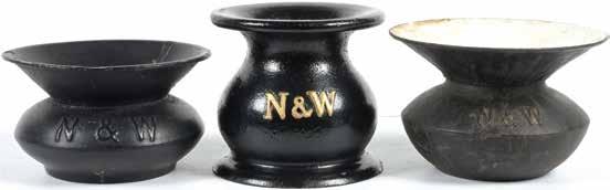 Largest: 8 - 1/2” D. x 7 - 1/4” T. (A) A heavy German silver spittoon with a weighted base and the N&W Railway round logo embossed in the side. This unit has many dents in the side of the bottom part. (B) A cast iron spittoon with “VGN. RWY” embossed on the top side. This unit is painted gloss black, with significant paint loss. (C) A cast iron body with enameled insides, nicely cast “N&W” in serif font on the side. Old black paint is significantly deteriorated and soiled. (D) A cast iron spittoon with “N&W” cast on the body in serif font. Black paint appears to be recent. (E) A cast iron spittoon with “N&W” cast in block letters on the body. Gold paint on the body, and a porcelain cup and flange. (Good). 400 - 1,000
