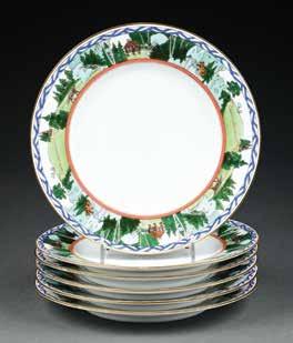 Each: 9 - 1/2” Dia. Six Kornilov Brothers porcelain plates, early 1900s. Marked on bottom with shield and “Made in Russia by Kornilow Bros”. 9 - 1/2”d. (Excellent) 800 - 1,600