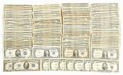 (A) 74 $1 silver certificates, mostly 1934, circulated. (B) 100 $1 silver certificates, 1935. (C) 59 $5 silver certificates, 1928 and 1934. (D) 7 $5 silver certificates, 1953. (E) 2 $10 silver certificates, 1934. All heavy circulation. 1,000 - 1,300