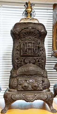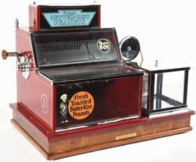 12 - 1/2” x 7 - 1/4” x 11 - 1/2”. C. 1910. Cast Iron cigar nipper with lighter advertising Rosina Vokes cigars. CONDITION: Some loss to plating and in-painted advertising. With replaced lighter dips, and blue glass globe. Need a clock key to wind. Operational. (Good) 600 - 1,500