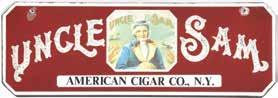19 - 1/2” x 9 - 1/2”. SST. Makers marked “American Co. Phila.” This c. 1920s single-sided tin tacker sign from Cinco Cigars features the iconic company colors and script logo. CONDITION: The field of this sign shows light crazing to the paint throughout the field. There are also a few scuffs and discolored areas seen in the yellow background. The outer edges show paint chips and wear throughout. (8). 300 - 600