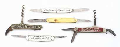 Busch 1922 pearl handle pocket knife; a C.F. Blanke Tea and Coffee Company enameled pocket knife with three blades and a corkscrew; another Blanke’s Coffee knife with two broken blades, and the fifth is a pearl-handled pocket knife, marked with the Monogram “M.” CONDITION: All show areas of wear and some fading to the labeling. (Good) 400 - 800