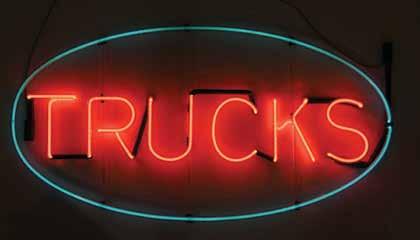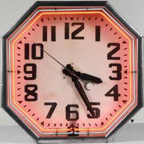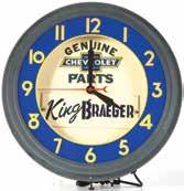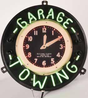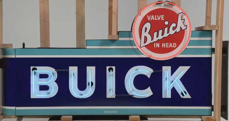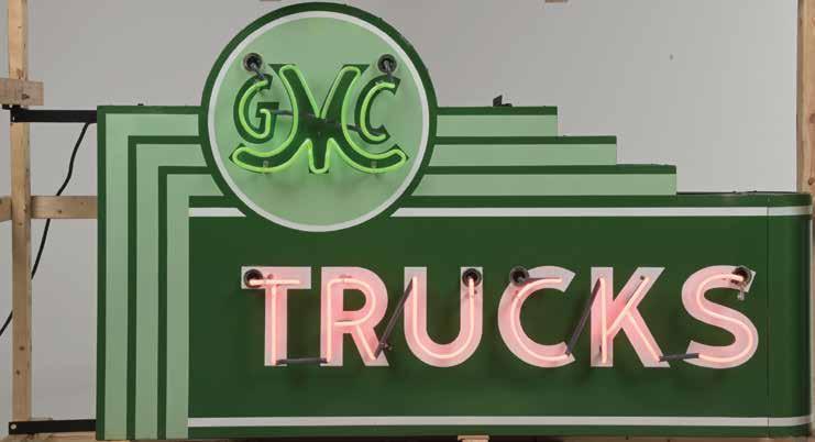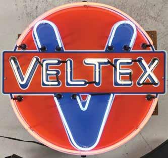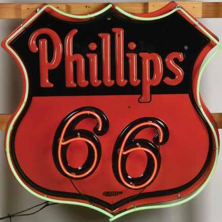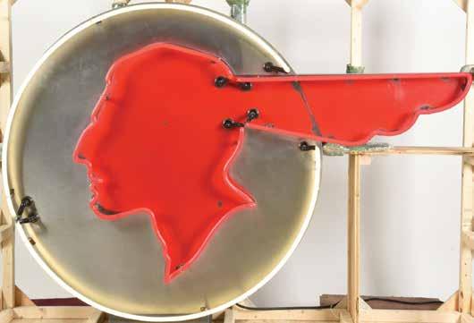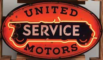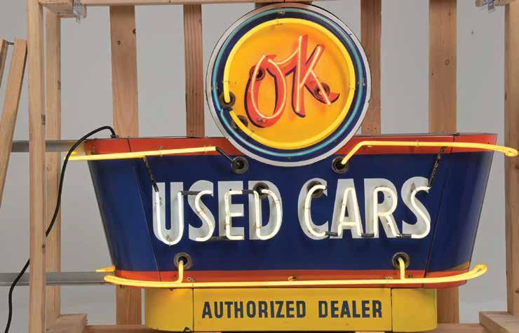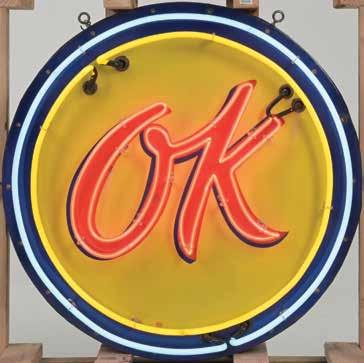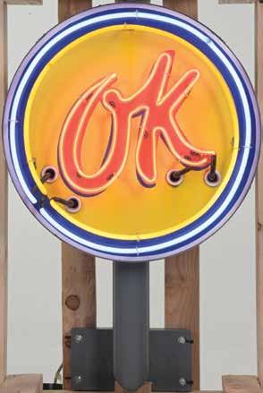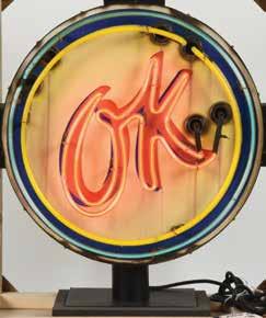23” x 11” x 38”. SSP. C. 1950’s Porcelain Neon Sign for OK Used Cars showing three colors of glowing neon with original animator flashing “OK” lettering. CONDITION: Sign is overall excellent showing very good color & gloss with limited surface wear in the field. Sign shows some very minimal wear at the stanchion holes and is mounted on the original stainless steel can. Can shows a unique wall mount attachment that bolts to the wall allowing for a three dimensional display. An excellent displaying example overall. This is not a standard shippable item and will require 3rd party shipping or pickup arrangements to be made. (GRADE 90). 4,000 - 6,000