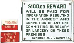 Largest: 10” X 8”. Collection Consists Of: One Conoco “$100 Reward” Porcelain Sign as well as two Porcelain Barrel Tags from Flying A & Associated. CONDITION: Signs are each in excellent condition with limited wear in the field as well as some minor chips along the outer edges. Each sign showing outstanding color & gloss and overall displaying well. (VARIOUS). 200 - 400