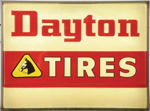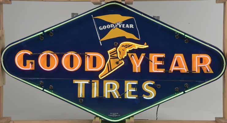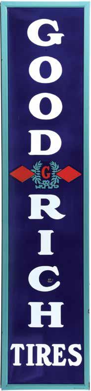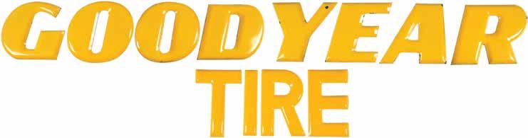 66” x 23.75” SSP. Marked on the Back “Property of the Goodyear Tire and Rubber Company.” This C. 1930’s single sided porcelain sign from Goodyear Tires featuring the iconic winged foot logo. CONDITION: The field of this sign shows wonderful color and gloss. There are surface scuffs and marks in the field, which is most notable in the yellow lettering. There is some brown paint splatter in the top of the “R” in “Goodyear.” The outer edges and mounting holes show porcelain loss and wear (8.0). This is not a standard shippable item and will require 3rd party shipping or pickup arrangements to be made. (8.0). 1,000 - 2,000