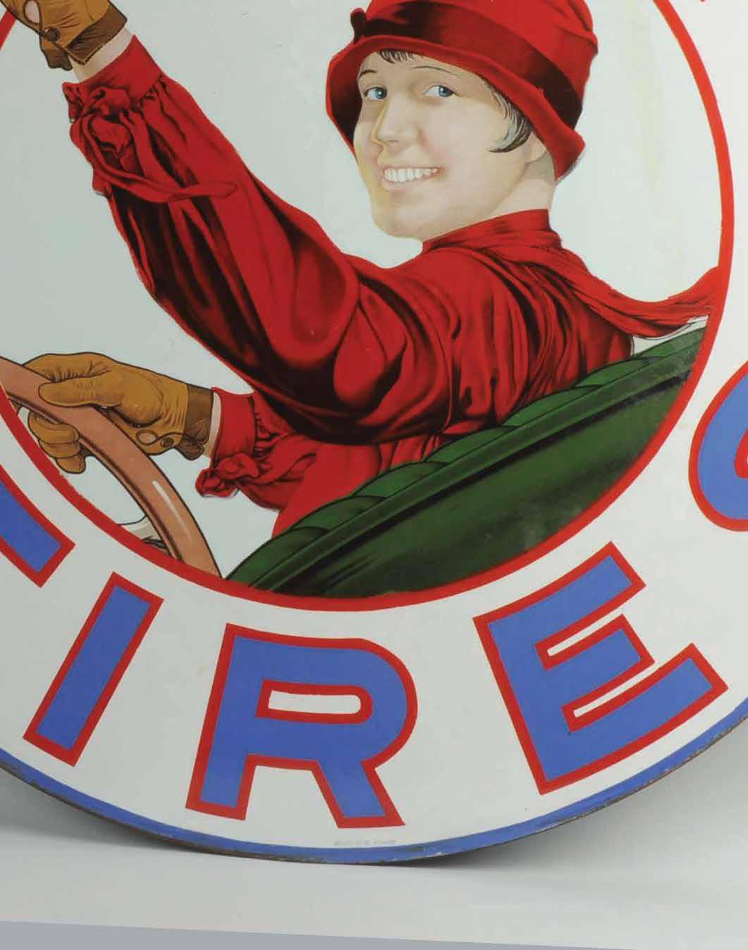 34” X 21.75” X 2”. DSP. This C. 1930’s double sided porcelain flange sign from Goodyear features a wonderful graphic of a large tire with the iconic company logo in the center. CONDITION: This sign has been professionally restored at some point in the past, which was only discovered after close inspection. The gloss and color are outstanding. There are a few small nicks to the porcelain on the flange section of the sign, but nothing distracting from the over all appeal of the piece. (RESTORED). 2,000 - 4,000