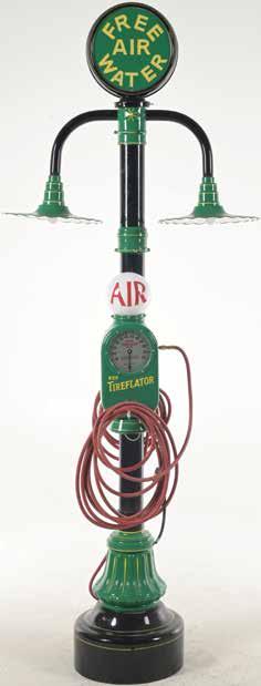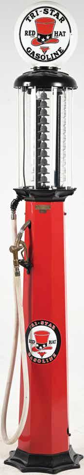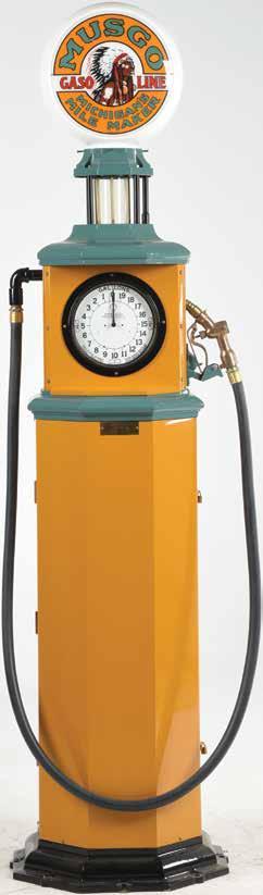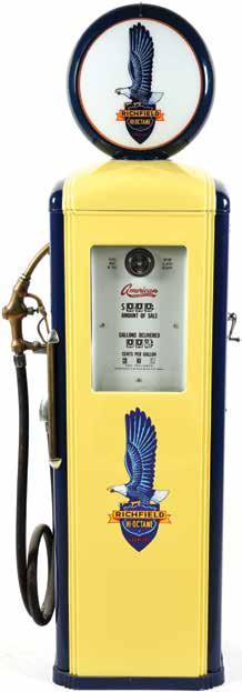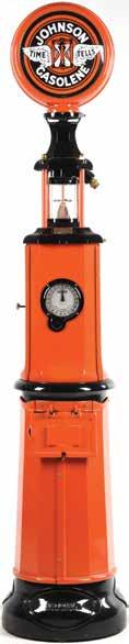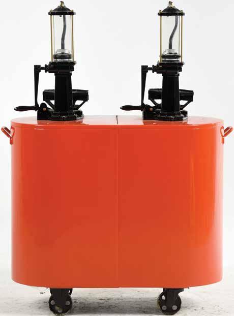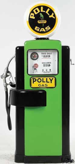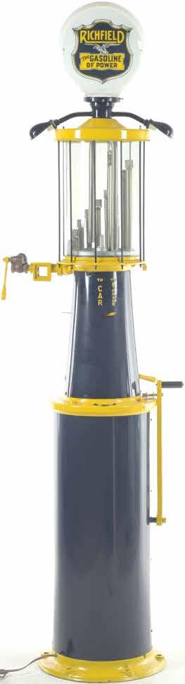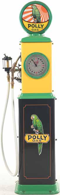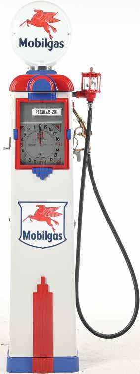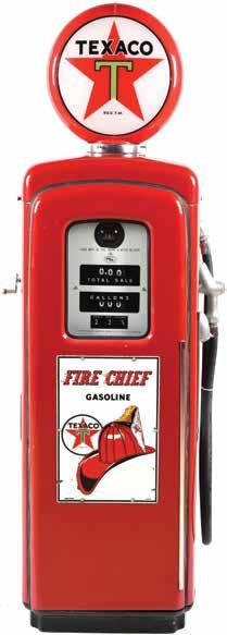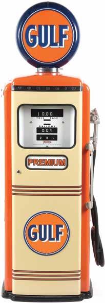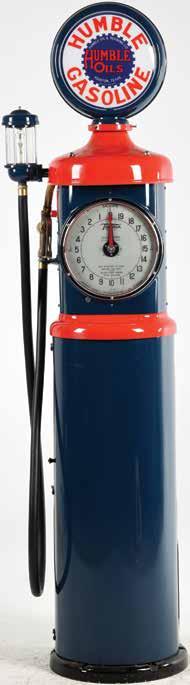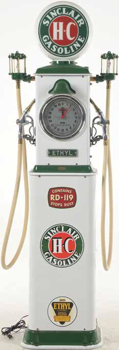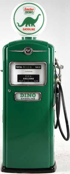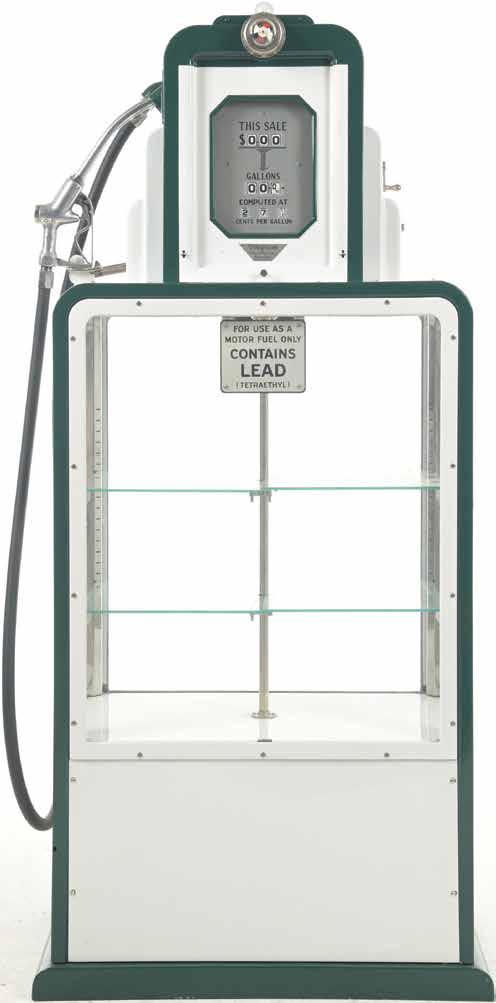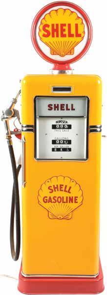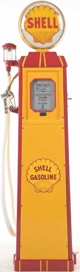 60” x 21” x 16” C. 1950’s Bowser Model #585 Gas Pump showing an outstanding restoration done in Shell Gasoline. CONDITION: Pump shows an incredibly well done restoration throughout with reproduction Shell Gasoline Pump Plates as well as “Contains Lead” porcelain signs. Pump shows black hose with metal nozzle with a reproduction Shell Globe at the top. An incredibly well displaying piece with bright color and excellent gloss. This is not a standard shippable item and will require 3rd party shipping or pickup arrangements to be made. (RESTORED). 2,000 - 4,000