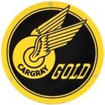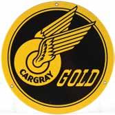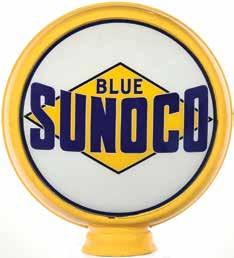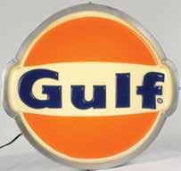 10.5” Dia. SSP. C. 1940’s Porcelain Pump Sign for Gulf No-Nox Knockproof Gasoline. CONDITION: Brilliant color & gloss with only minimal surface wear in the field from storage as well as some minor factory blemishes. Mounting holes are in excellent condition with only faint wear at the outer edge. A brilliant example overall. (GRADE 92).