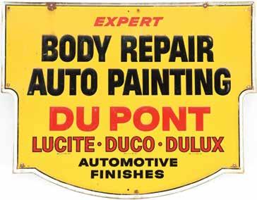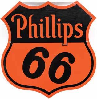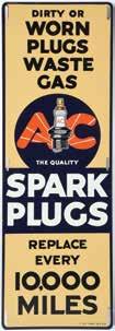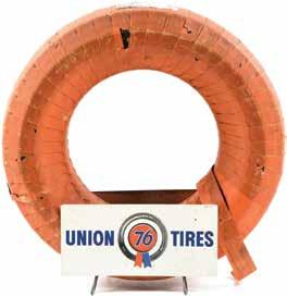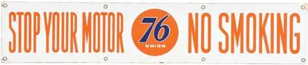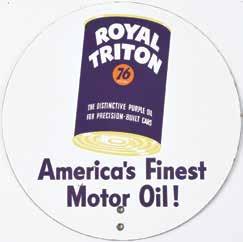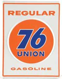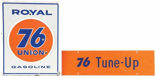 18” x 14” largest SSP. A nice collection of two C. 1950’s porcelain signs from Union 76 including a Royal Gasoline embossed pump plate and a “Tune Up” sign. CONDITION: The pump plate shows approximately seven small porcelain chips in the field. The outer edges and corners also show porcelain loss in a few isolated areas. The color and gloss remain bright and vibrant (8.0). The Tune Up sign remains exceptionally clean with no porcelain chips in the field. The top right mounting hole shows very light porcelain loss. Otherwise the sign is bright and glossy (9.0). (8.0,9.0). 300 - 600