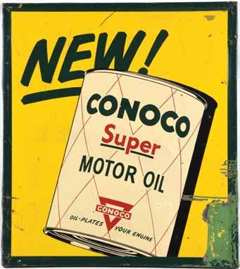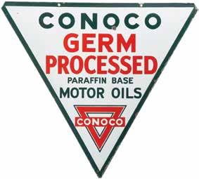 28.5” X 25.5”. DSP. Maker Marked “Burdick Enamel Sign Co. Chicago & Balto.” This C. 1930’s double sided porcelain sign from Conoco Motor Oils features the iconic company colors and wonderful diecut triangular shape. CONDITION: Side 1 shows good color and shine in the field. There is diagonal spiderwebbing on the right side of the sign. The spiderwebbing begins in the second “O” of the top line word “Conoco” and extends diagonally down through “Germ Processed” to the green outer border. There are also a few scattered porcelain chips in the same area. The outer edges of the sign remain clean with only a few porcelain chips- most notably on the bottom point and the upper mounting holes (8.0). Side 2 retains good gloss and color with some light surface scuffs spread around the field. There is one porcelain chip in the field in the second “O” of “Conoco.” The top left corner shows specks of discoloration in the white field. The outer edges have porcelain chips and wear, most notably on the right edge and mounting holes (8.0). (8.0,8.0). 800 - 1,600