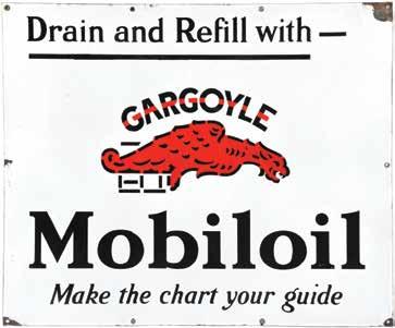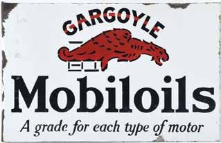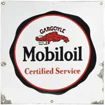 19.5” X 19.5”. SSP. C. 1920’s Porcelain Sign for Mobiloil showing Fried Egg style graphic with Gargoyle. CONDITION: Sign shows outstanding color & gloss throughout with very limited surface wear in the field showing only minor scratches. Sign shows moderate to heavy chipping along the lower edge with areas of mounting hole wear. Overall a scarce and well displaying piece. (GRADE 85). 750 - 1,500