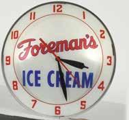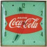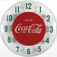 15” x 15” x 3.5” A C. 1960’s light up clock from Coca-Cola featuring the iconic fishtail design and company logo. CONDITION: The inner face of the clock shows good colors with light crazing and flaking to the paint in the center graphic. The outer body of the clock shows light surface oxidation and wear. The clock is not currently lighting or keeping time. An old power cord is still attached. (7.0). 100 - 200