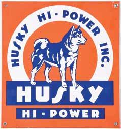1006 - HUSKY HI-POWER GASOLINE “LARGE” PORCELAIN PUMP PLATE SIGN W/ HUSKY DOG GRAPHIC.