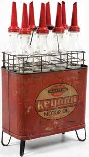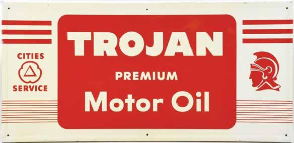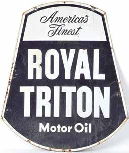120.5” X 14.25” X 2”. SSP. A large and impressive example of this C. 1950’s single sided porcelain sign from Royal Triton Motor Oil featuring wonderful gold leaf lettering in the “Triton” logo. CONDIITON: The field of this sign retains good color and shine. There are a few areas in the outer field that show a slight dulling to the gloss. The mounting holes show light porcelain loss. This sign is in an original white metal frame, which nicely conceals the edges and allows for easy hanging. The porcelain frames shown areas of chipping and discoloration as well. This is not a standard shippable item and will require 3rd party shipping or pickup arrangements to be made. (8.0). 1,000 - 2,000