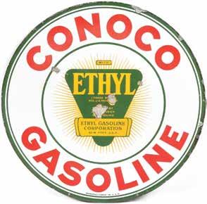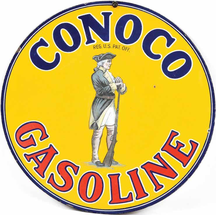 25.25” Dia. DSP. C. 1920’s Porcelain Service Station Sign for Conoco Gasoline showing Minuteman graphic. CONDITION: Sign shows good color & gloss throughout the yellow of each side with well displaying “Conoco Gasoline” lettering. Sign shows moderate outer field chipping on each side as well as a heavy amount of wear in the lithograph Soldier graphic. Sign shows some minor chips at the outer edge and mounting hole. Although worn the piece displays well and is exceptionally scarce and early. (ORIGINAL). 1,500 - 3,000