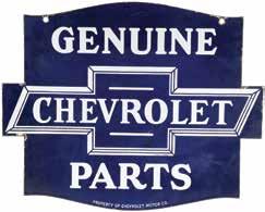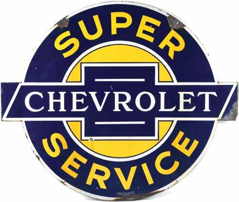 48” X 24.5”. DSP. A rare and incredibly eye-appealing die-cut Porcelain Sign from Chevrolet Automobiles advertising “Truck Service”. Sign shows a large Chevrolet Bowtie graphic as well as iconic Chevrolet blue and yellow Porcelain. CONDITION: Side 1 shows great color and gloss in the field. There are a series of small touched up areas in the yellow section of the field. There is a noticeable chip just above the “L” in “Chevrolet.” The mounting holes show wear and touch up. The outer edges are nice with occasional porcelain loss and discoloration (7.5). Side 2 remains in similar condition with touched up areas scattered around the yellow sections of the field. The mounting holes are solid but have touch up as well. There is a porcelain chip in the letter “C” of “Service,” as well as, chips with touch up in both corners the sign below the letter “C’ and letter “T.” The gloss and color remain vibrant (7.5). This is not a standard shippable item and will require 3rd party shipping or pickup arrangements to be made. (7.5,7.5). 4,000 - 8,000