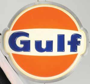 10.5” Dia. SSP. C. 1950’s Porcelain Pump Plate for Gulf Gasoline showing iconic Gulf colors. CONDITION: Overall outstanding showing excellent color & gloss throughout with minimal surface wear to note. Very minimal mounting hole wear with some minor nicks along the outer edge. A bright and glossy example. (GRADE 92). 300 - 600