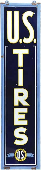 71.5” x 23.5” SSP. Maker Marked “Beach. Coshocton, O.” This C. 1930’s single sided embossed porcelain sign from US Tires features the iconic company logo with wonderful gloss and color. CONDITION: The field of this sign retains wonderful gloss and shelving. There are a few porcelain chips in the field, most notably in the letter “R” and to the right of the word “Safety.” The outer edges of the sign show porcelain chipping throughout, the worst of which is in the bottom right corner (8.0). This is not a standard shippable item and will require 3rd party shipping or pickup arrangements to be made. (8.0). 1,200 - 2,400