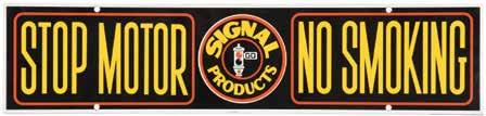 26” X 6”. SSP. Contemporary Porcelain Sign for Signal Gasoline showing “Stop Motor No Smoking” with Signal Stoplight graphic. This is a newly made reproduction/fantasy sign. CONDITION: Sign is brilliant in like new condition showing outstanding color & gloss with no notable wear. (Excellent). 200 - 400