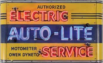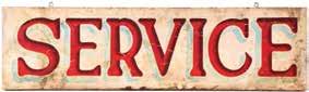 50” x 9” x 12”. SSP. Maker Marked Haden. A bright and glossy example of this Porcelain Neon Arrow showing Service with neon blue outer border. CONDITION: Sign shows outstanding color & gloss throughout with one chip at the “C”. Sign shows heavier chipping at the arrowhead upper tip as well as some light chipping along the outer edge. Sign shows working bright blue neon and is mounted on a newly made metal can which displays the piece nicely. An excellent example. This is not a standard shippable item and will require 3rd party shipping or pickup arrangements to be made. (GRADE 87). 2,500 - 4,500