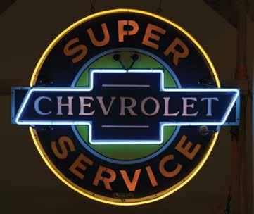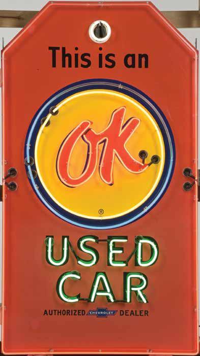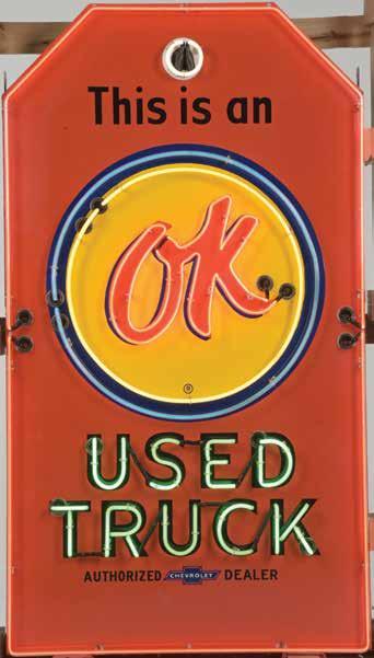 Sign: 74” X 40.5” X 8.5”. SSP. Unique and well displaying large Porcelain Tag Sign for Chevrolet OK Used Cars showing large OK graphic with five colors of added neon. CONDITION: Sign shows excellent color & gloss throughout with four small areas of color match in the inner & outer field as well as some light touch up at the mounting holes. Sign lights up beautifully in five colors of added neon and dismounted to a newly made can. A beautiful displaying piece of OK advertising. This is not a standard shippable item and will require 3rd party shipping or pickup arrangements to be made. (EXCELLENT). 6,000 - 12,000