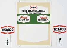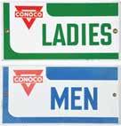 13.75” x 3.5” largest SSP. A nice collection of two porcelain signs including a Defective Tools Notice sign from Conoco and a Ladies restroom sign from Sunoco. The Notice sign is marked “Property of Continental Oil Company” and the Ladies sign is marked “Made in USA A676.” CONDITION: The Notice sign shows good color and gloss in the field with a few specks of of porcelain loss around the outer edges, likely from the factory. The mounting holes are solid and retain their original grommets (9.0). The Ladies sign shows a few surface scuffs in the field and one porcelain chip to the upper right of the left mounting hole. The outer edges show light porcelain wear as well (8.75). (9.0,8.75). 300 - 600