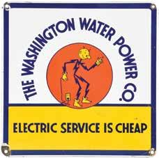 1637 - THE WASHINGTON WATER POWER COMPANY PORCELAIN SIGN. 12” X 12”. SSP. C. 1950’s Porcelain Sign for Washington Water Power Company showing Ready Kilowatt style graphic with slogan, “Electric Service Is Cheap”. CONDITION: Excellent color & gloss showing minor surface scratching in the field with excellent condition graphic. Chipping at three of the mounting holes with light nicks at the outer edge. (GRADE 88). 250 - 500