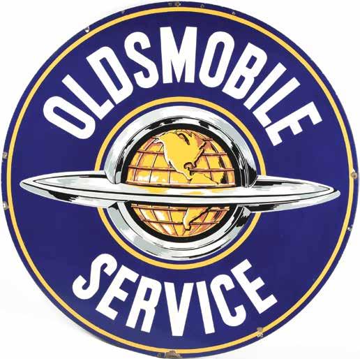48” X 31.5”. DSP. This C. 1940’s double sided porcelain sign from Studebaker Erskine Service features the iconic company logo with good colors throughout. CONDITION: Side 1 shows good color and shine. Something has splattered onto this sign at some point in the past, leaving white areas of discoloration to the color, most notably in the blue background. There are a few small negligible porcelain chips in the field as well. The outer edges show general porcelain wear and chipping, the worst of which is around the two mounting holes along the top border (7.5). Side 2 shows a dulling and chalkiness to the gloss throughout- this is most seen in the dark blue background but extends into the lettering and graphic. There are a few small chips in the field. The outer edges show general porcelain wear and loss, the worst of which is around the two mounting holes (7.5). This is not a standard shippable item and will require 3rd party shipping or pickup arrangements to be made. (7.5,7.5). 1,500 - 3,000