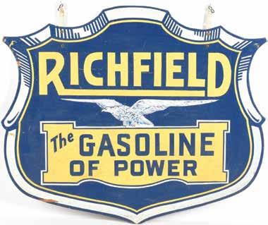 12.75” X 11”. DSP. C. 1930’s. Scarce Service Station Flange Sign for Union Oil Company showing “Credit Cards Honored Here”. CONDITION: Sign shows fair color & gloss throughout each side showing moderate to heavy chipping as well as areas of discoloration and dullness. Flange portion shows heavy chipping and was once flatted. Although heavily worn it is rare and well displaying. (GRADEAUTHENTIC). 250 - 500