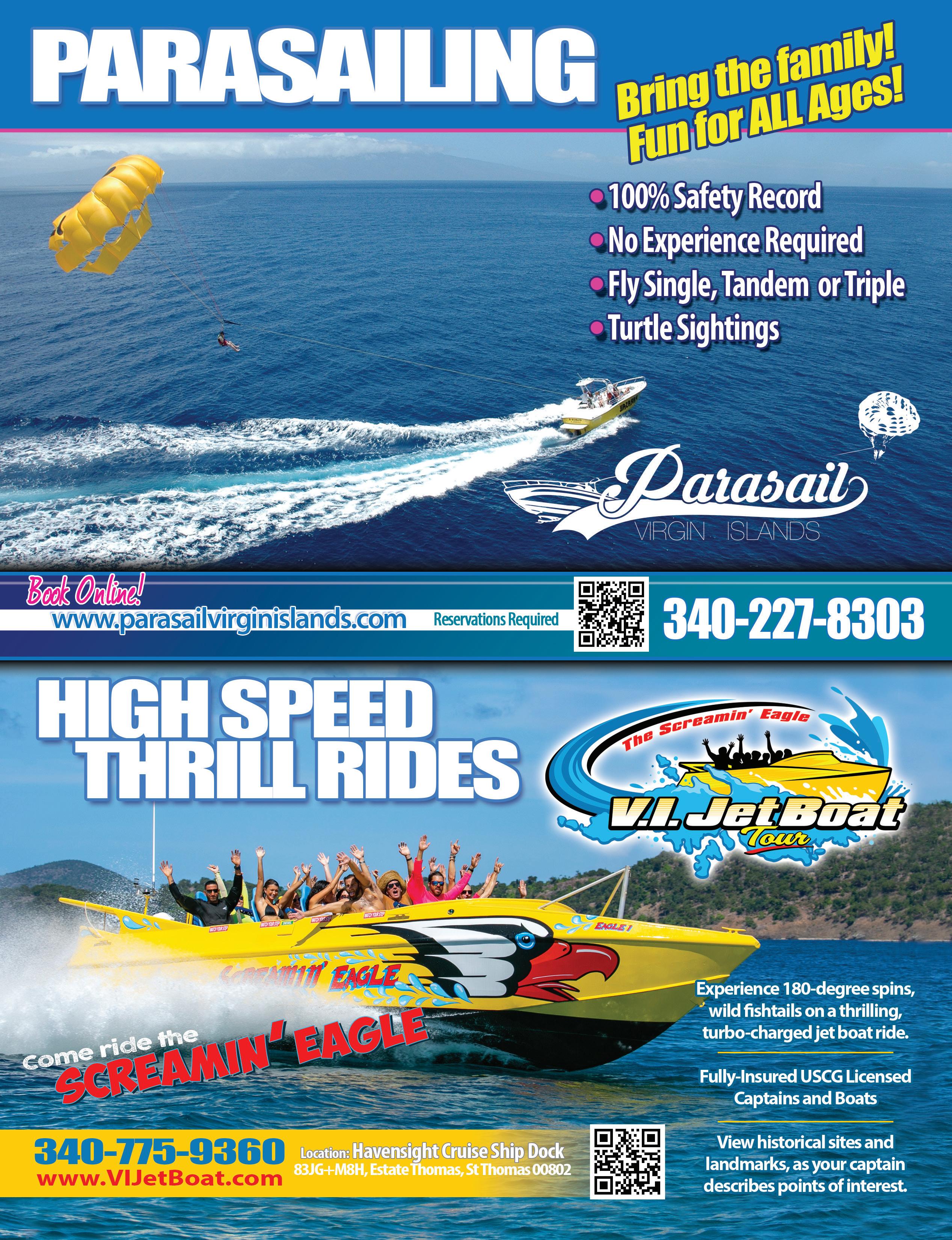 St. John offers visitors some of the best watersports in the world. Options include day sails, private charters, parasailing, sunset sails, wave runners, kayaking, scuba, SUP, scuba diving and more. Check out ads in this magazine to find a variety of purveyors of watersports and adventures.