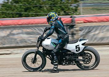 Meanwhile, therehas been aquiet,slow-growingflame fromacrossthe pond –flat trackracing. Flat trackismostly runonspeedwayovals butcan be on horsetrottingtracks, andsomeTTcourses even have left andright turns! Bikesrun arearbrake andsuspension, whereasspeedwaybikes have no brakes andver yminimal frontsuspensiononly– andwhenwe sayminimal,wemeanrubberbands